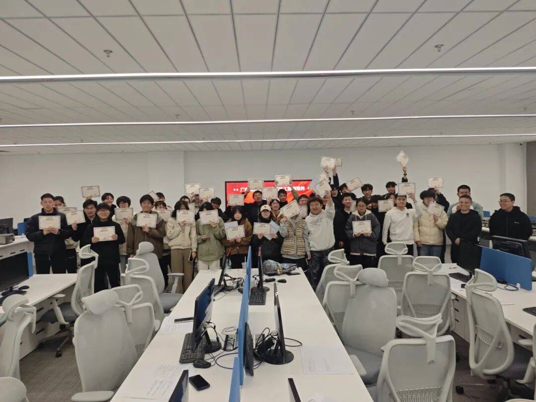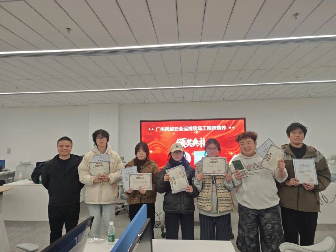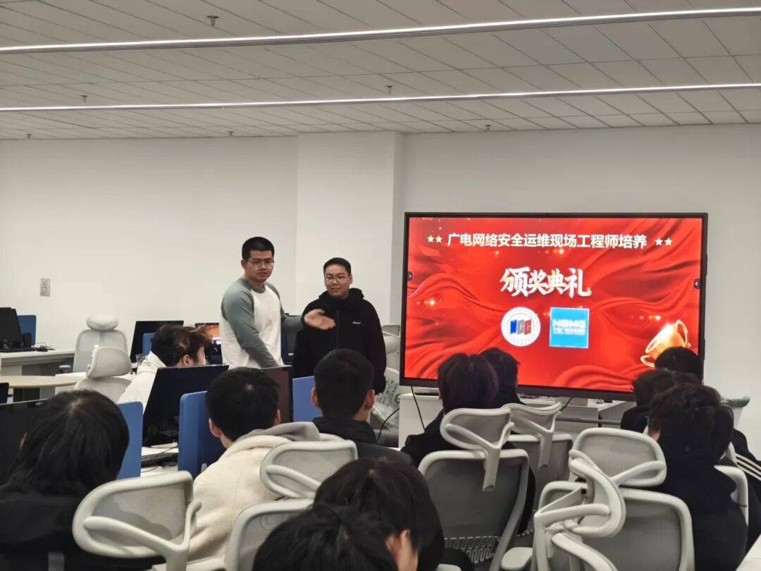 12月18日上午,项目举行结业颁奖仪式。主办方为全体学员颁发结业证书,并对在实训中表现优异的学生予以表彰▲★▲。其中,韦欣兰同学因综合考核成绩突出,荣获一等奖,由宁波市无线城市运营有限公司代表颁发荣誉证书。现场显示屏呈现“广电网络安全运维现场工程师培养 颁奖典礼★◁▽”主题画面,气氛庄重热烈。