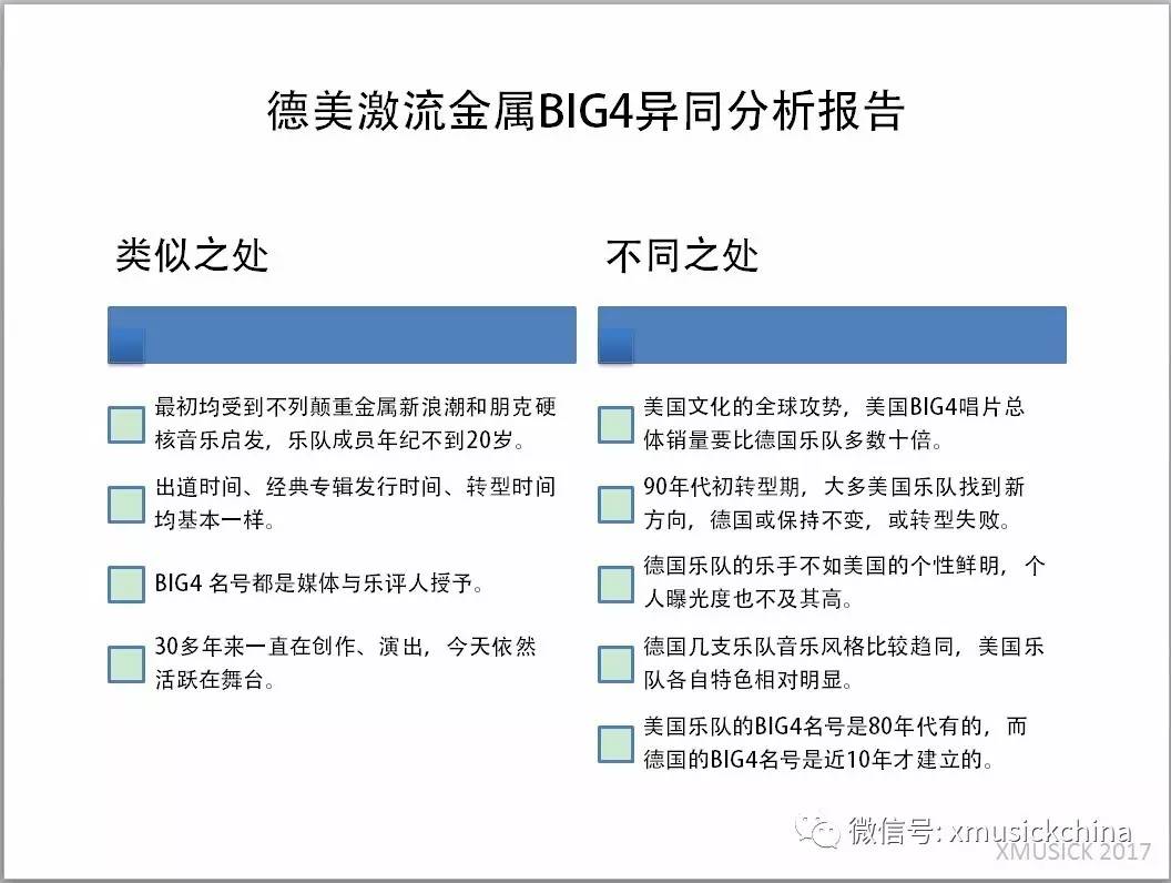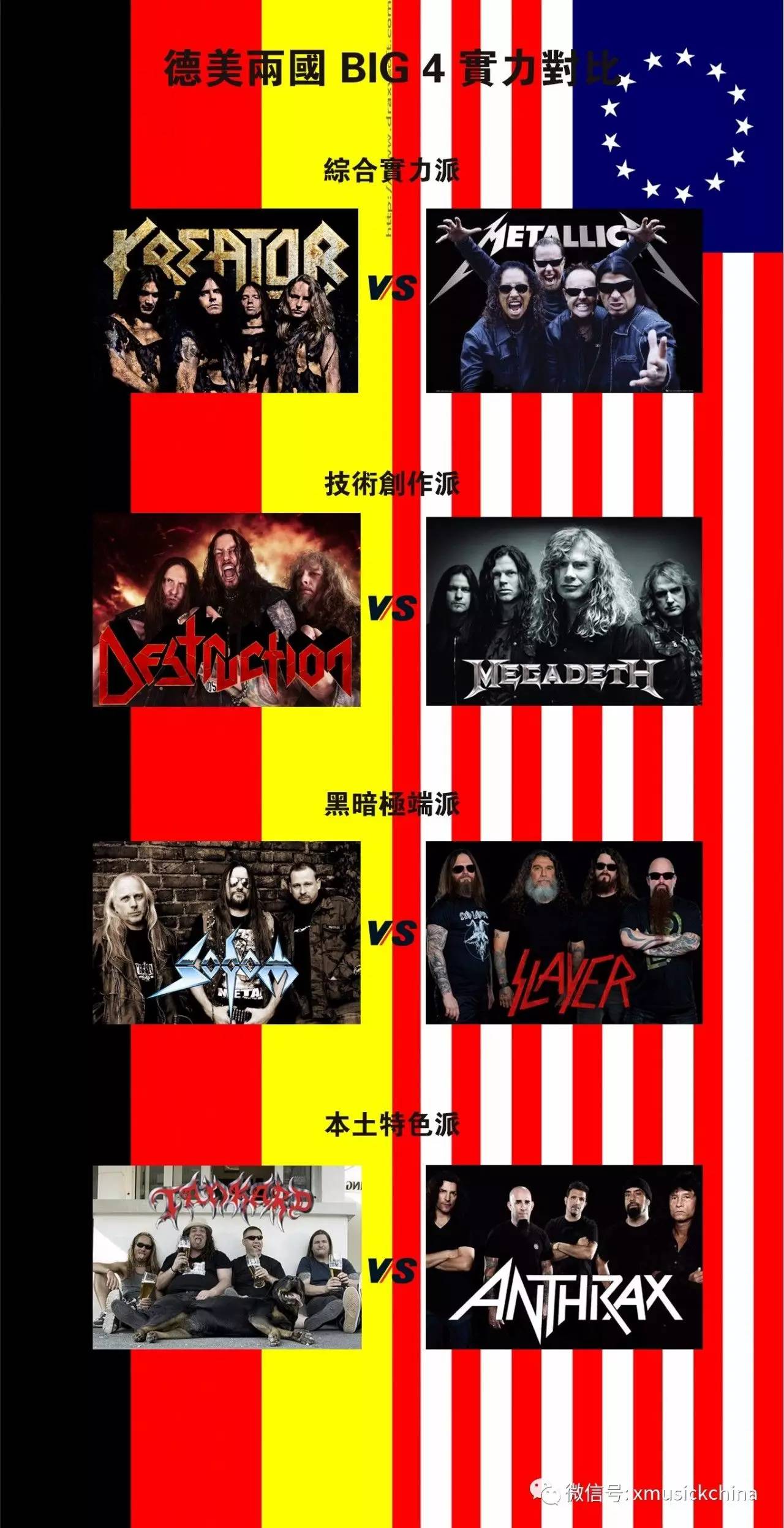 我们根据两个阵营中乐队各自特色•☆,来对阵相应乐队◁■●,可以看到实力差距还是很悬殊的。德国 BIG4 从销量◆,知名度以及演出规模▼★,基本只能和美国准一线激流实力相当…,如 TESTAMENT▼、 EXODUS、OVERKILL 等。如果不是比拼硬指标,只是比较个人感受,那么各花入各眼,可能有异议。我们也只是从数据来分析…。音乐本身个人感受是很难比对的。