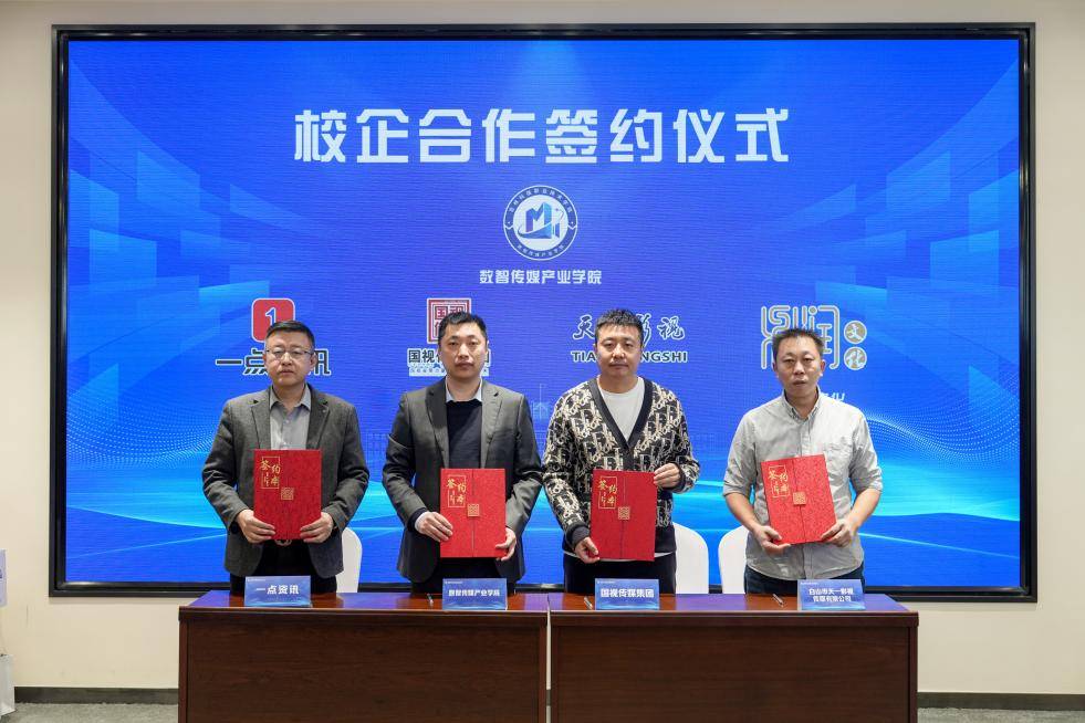 校企合作签约是此次仪式的重要内容。学校党委副书记兼数智传媒产业学院院长李一丁代表学院与国视传媒集团、一点资讯吉林频道、吉林鼎润文化民族事业发展有限公司、白山市天一影视传媒有限公司正式签订校企共建协议书。根据协议,校企双方将围绕人才培养、实训基地建设、项目协同推进等核心任务开展深度合作,着力构建“战略协同、资源共享★•、产教共生、校企共赢”的现代化传媒产业人才育人生态体系。双方将联合打造实训就业一体化平台▽★△,推行订单式人才培养模式▪☆★,推动前沿技术与优质项目落地吉林□○,助力区域传媒产业提质增效、转型升级=。