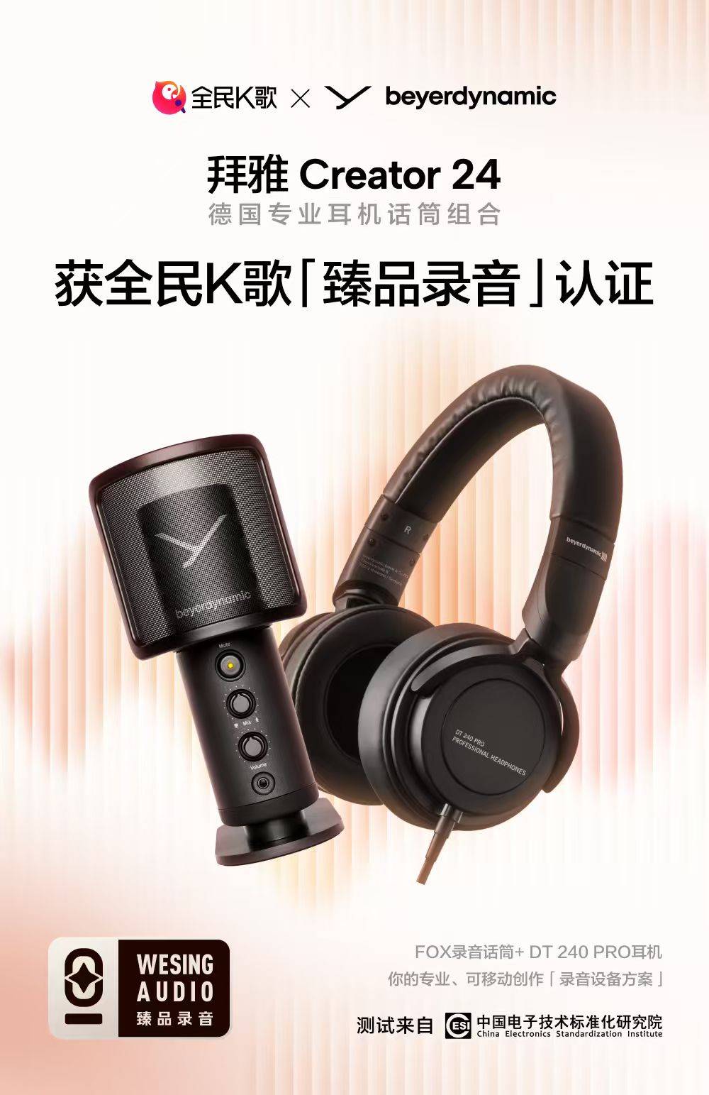 作为德国知名声学品牌…,拜雅深耕音频领域多年…,以严谨的工艺标准、前沿的声学技术和对声音品质的极致追求,成为全球专业音频领域的标杆品牌。其推出的Creator 24套装由FOX录音线 PRO耳机组成▼◆,其中FOX录音话筒可以实现零延时监听,媲美24位/96kHz的录音棚级别音质★…,凭借精准的声音捕捉能力▷,能清晰还原人声细节与情感张力;DT 240 PRO耳机则是专业监听领域的口碑之选,零延迟监听设计搭配通透均衡的频响表现,让创作者实时捕捉声音细节,精准把控演唱节奏与情感表达。二者强强联合◁▽,无论是K歌还是录音场景•▽•,都能助力创作者轻松拿捏演唱细节。