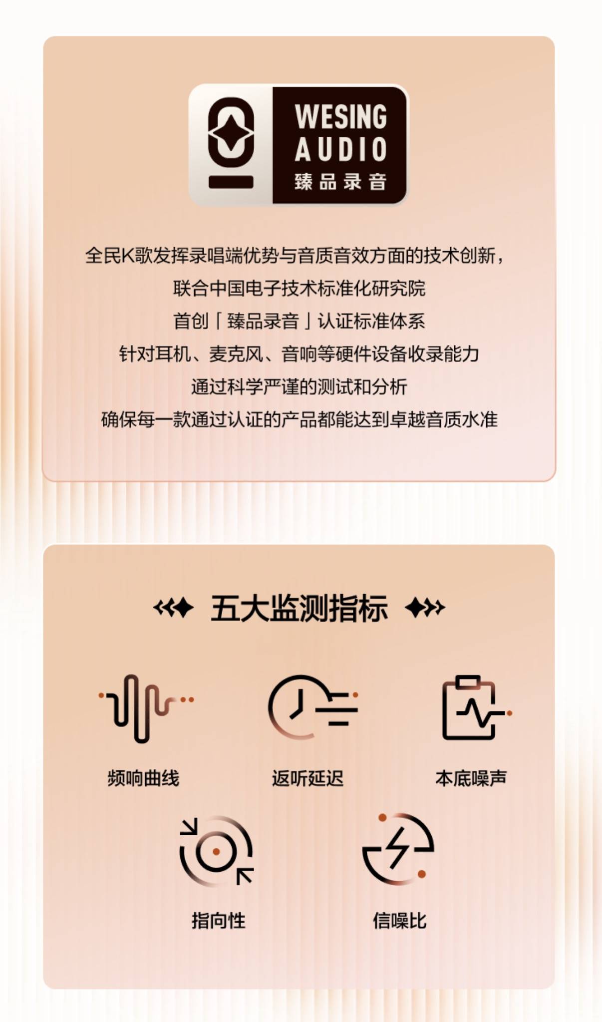据了解,臻品录音认证是全民K歌首创的针对录音品质检测的标准体系。基于录唱端优势与音质音效方面的技术创新,全民K歌联合第三方声学实验室——中国电子技术标准化研究院赛西实验室,率先制定并推出硬件设备收录能力的认证标准。该标准涵盖耳机☆、麦克风、音响等多种设备形态,依托国际先进测试仪器对设备的频响范围、本底噪声、失真、信噪比等核心参数进行客观评测□○,旨在通过科学严谨的测试和分析,确保每一款通过认证的产品都能达到卓越音质水准。