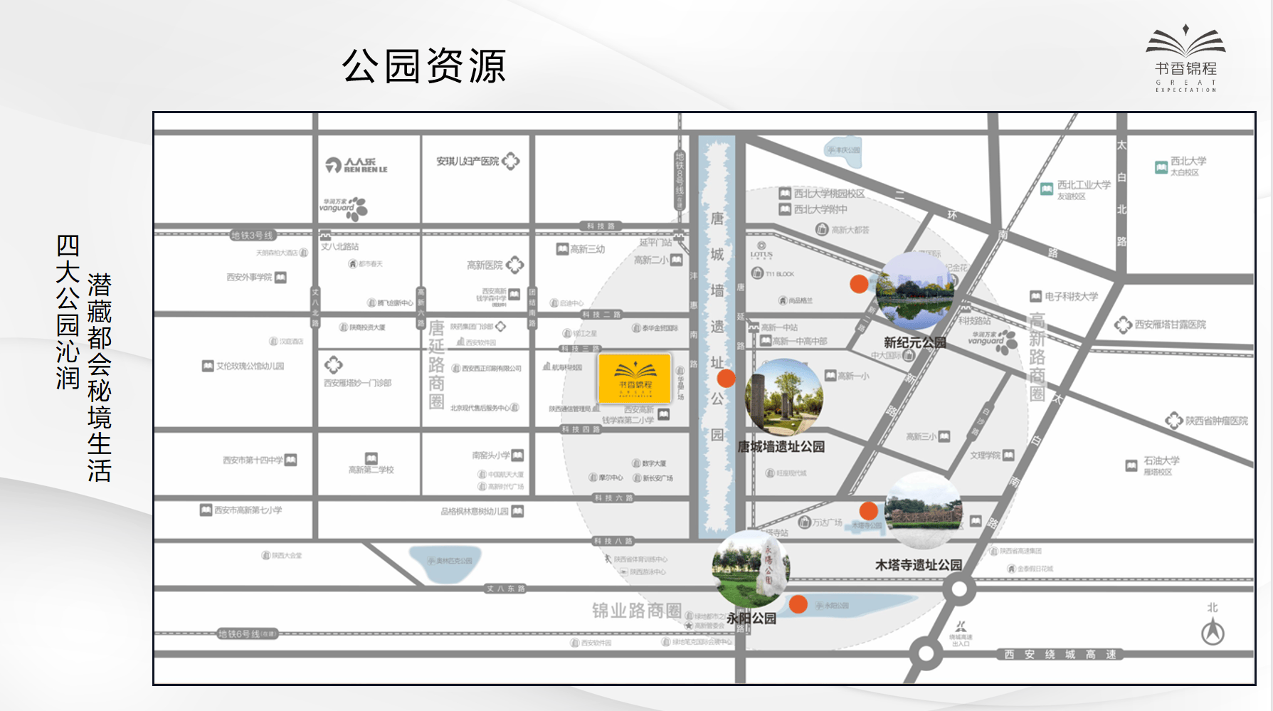 项目东侧100米即唐城墙遗址公园▪,唐城墙遗址公园南北全长3.7公里,东西宽约120米,占地面积44.4万余平方米的带型绿地公园。