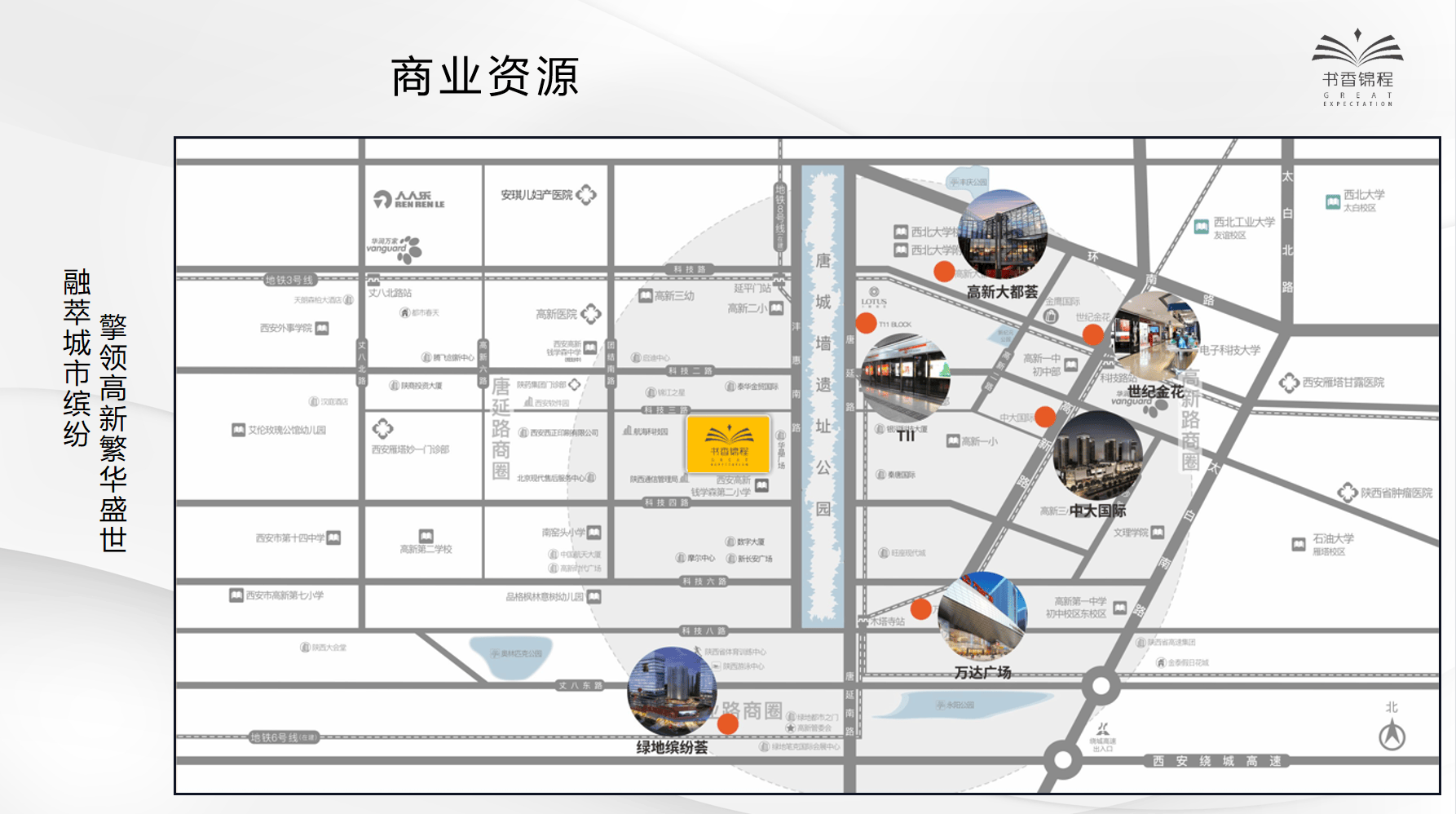 项目北侧2Km可到达科技路商圈,享受世纪金花、金鹰国际☆●、高新大都荟等商业资源◆;项目南侧3Km可达锦业路商圈,享受绿地缤纷荟等全新商业配套•▷◇。