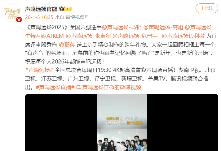 据了解,2026年1月4号晚上19:32,湖南卫视直播了最新一期《声鸣远扬2025全国总决赛》,本期是全国优秀歌唱人才选拔节目《声鸣远扬2025》总决赛第九场“五强争夺战”●•◁,赛前,生特吾姬、迈利撒、张卓尔、马韬--☆、高旭、危晋宇六位选手把大家联合为殷秀梅导师制作的新年礼物送到了后台。