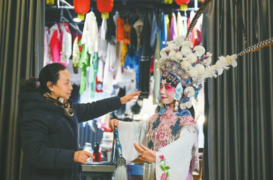 1月10日,成都三花川剧团化妆间外,来自深圳的•“05后”游客小唐(右)正在体验川剧妆造。