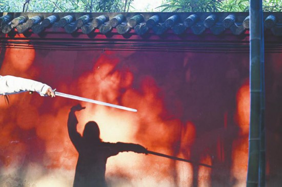 1月9日○,成都望江楼公园里☆•,一位年轻人正在练习传统武术。其飒爽的身影,与红墙光影相映。