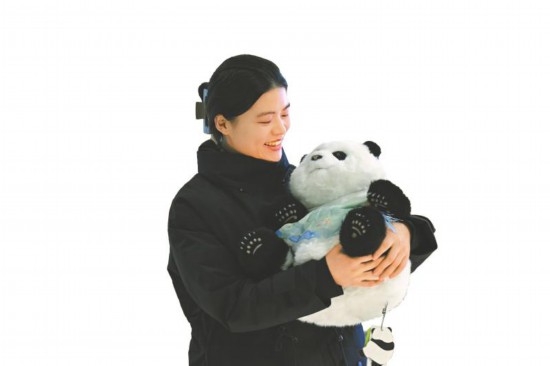 1月14日△△◁,成都暑袜街熊猫邮局内,江苏游客王湘麟与身着汉服的熊猫玩偶合影。