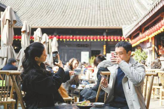 1月4日,成都大慈寺茶社内,来自广东的游客黄子宏(右)与女友在喝盖碗茶•▷▪。