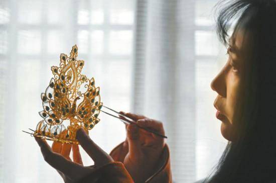 1月11日▽◇,国风博主何艳红正在展示一款运用成都银花丝非遗技艺制作的唐风花丝凤冠◆▪-。