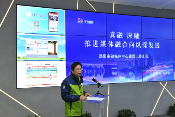 在一楼的融媒体指挥中心,嘉宾参观并听取了溧阳融媒体中心建设运行情况汇报,观看了融媒体渠道发布及直播设置等演示。