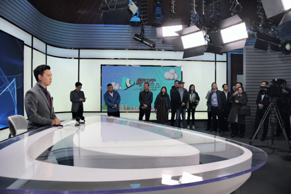 在二楼,嘉宾们参观了全媒体新闻演播室、综艺演播室、虚拟演播室和非编大厅。值得一提的是,综艺演播室主要是服务于市委市政府和各部委办局重大活动的发布,同时也是中央电视台的录制基地。嘉宾们正巧遇上了央视的《百家讲坛》在此录制。