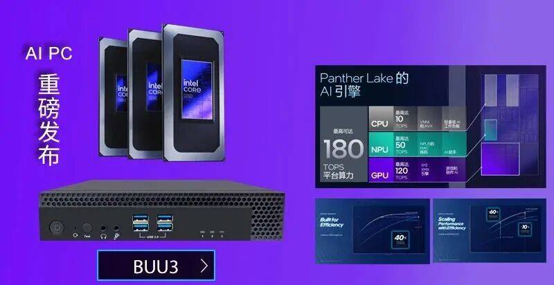 该平台通过XPU异构架构实现了颠覆性的180 TOPS端侧AI总算力。其NPU算力高达50 TOPS,能效比卓越,可低功耗运行持续AI任务;采用全新Xe3架构的GPU则提供120 TOPS算力,轻松驾驭高负载的AI渲染与创作;CPU性能亦获得显著提升,可为智慧教育、工业控制、智慧医疗等多元场景带来核心算力革命,重新定义AI PC的生产力边界。