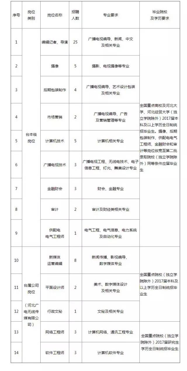 为促进事业产业发展,增强核心竞争力,根据河北广播电视台工作需要,面向2017年应届毕业生招聘专业技术人员67名。